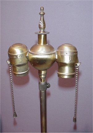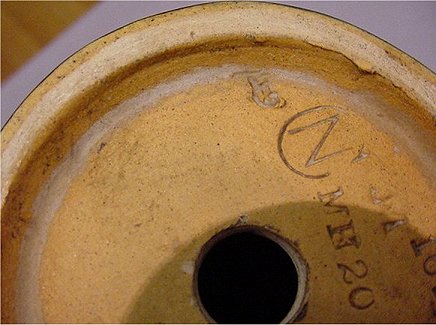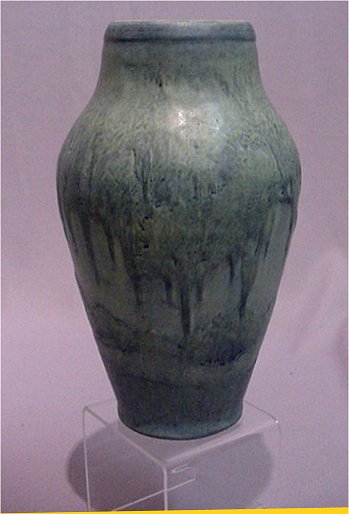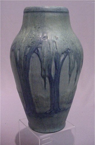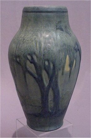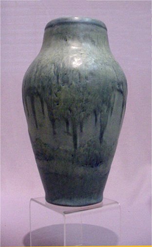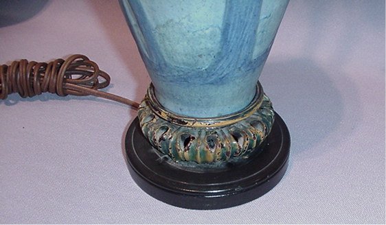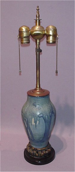 LOT 20) NEWCOMB COLLEGE ART POTTERY LAMP: Slightly raised moon lit southern scene of oak trees dripping in Spanish Moss, in shades of blue. Markings indicate Joseph Meyer as the potter, Anna Frances Simpson as the decorator, Ca 1922. The pottery lamp body is 8.5". 20"h. overall.