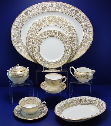 WEDGWOOD ''GOLD FLORENTINE'' FINE CHINA SERVICE FOR 8: 58 pieces to include large 17'' PLATTER, a 14'' PLATTER, oval VEGETABLE BOWL, CREAMER, covered SUGAR, 9 dinner plates, 10 3/4''dia., 8 salad plates, 7 bread plates, 8 dessert bowls, 12 CREAM SOUPS with underplates, 6 cups and saucers and 3 pedestal cups and saucers. All in excellent condition.