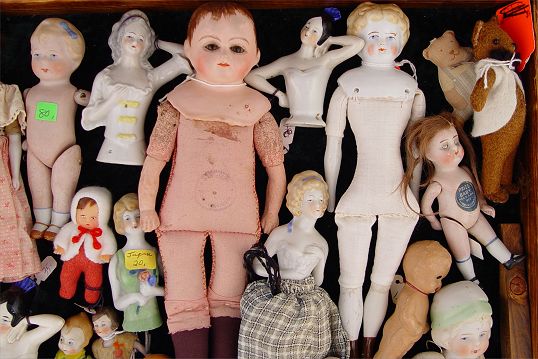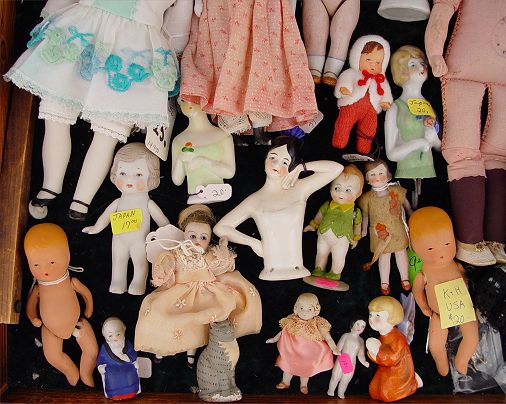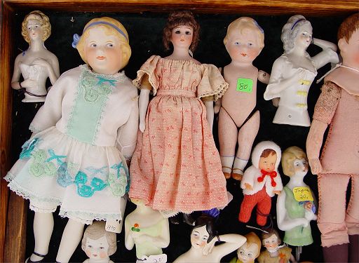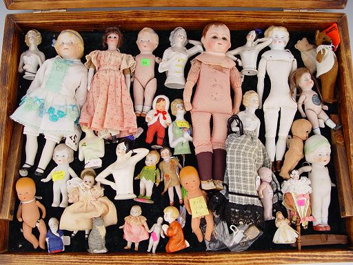 ASSORTED DOLLS IN CASE: 1) Bisque head, hands and legs, G. Heubach, white cotton dress, 9''. 2) bisque head, and arms, washable cotton body, open glasses, painted hair, no clothes, leather shoes, 9 1/2''. 3) Porcelain head, arms and legs with porcelain painted shoes, cloth body, no clothes, 8 1/2''. 4) Bisque head, arms and legs, brown wig, open glass brown eyes, pink dress, 7''. 5) Porcelain half doll with green and black check skirt, 3 1/4''. 6) Bisque full body jointed doll, no clothes, 5''. 6) Porcelain half doll, arm raised to back of hair, mk Germany 8030, 4''. 7) Porcelain half doll, Spanish comb in hair, raised hand to cheek, mk Germany 4040, 3 1/2''. 8) Smaller version of Spanish half doll, 3''. 9) Porcelain Flapper half doll, 3''. 10) Porcelain half doll with hand to breast, 3''. 11) Bisque Nippon Doll, jointed arms, mk 101 NIPPON, no clothes, 5 1/2''. 12) Porcelain half doll with hook attached to bottom, mk Made In Japan, 3''. 13) Bisque, jointed arms and legs, has Prize Baby sticker on front body