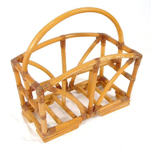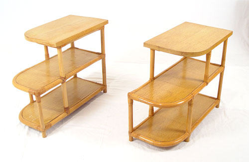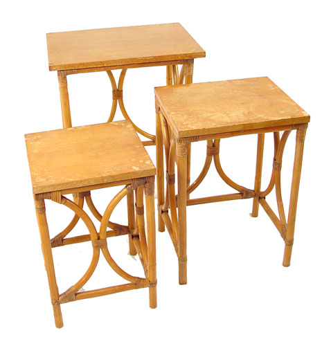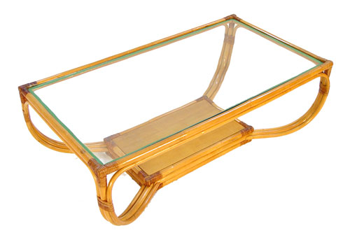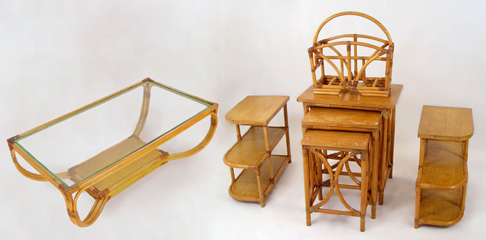 7 PC GROUP OF FRANKL STYLE RATTAN SIDE TABLES: Glass top coffee table measures 16 1/4'' high x 48'' long x 26'' deep. 2 side tables measure 20'' high x 25'' x 12''. 3 stacking tables, largest table measures 26'' high x 22'' wide x 16'' deep, note veneer chips. Magazine rack measures 18'' high x 18 1/2'' wide x 10 1/4'' deep.