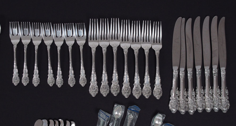 WALLACE SIR CHRISTOPHER STERLING SILVER FLATWARE SERVICE: Approx. 61 pieces in the Sir Christopher pattern to include 8 forks (7 3/4''), 8 salad forks (6 3/4''), 16 teaspoons (6''), 8 soup spoons (6''), 8 hollow knives (9 3/4''), 8 butter knives (6 1/8''), serving spoon (9 1/4''), serving fork (9 3/8''), sugar scoop (8''), jelly server (6 3/4''), 6 demitasse spoons in original bags (4 1/8''), cake / pie server (10''), carving set (fork 11 1/2'', knife 13 7/8''). No monograms. Approx. 81.3 troy oz.