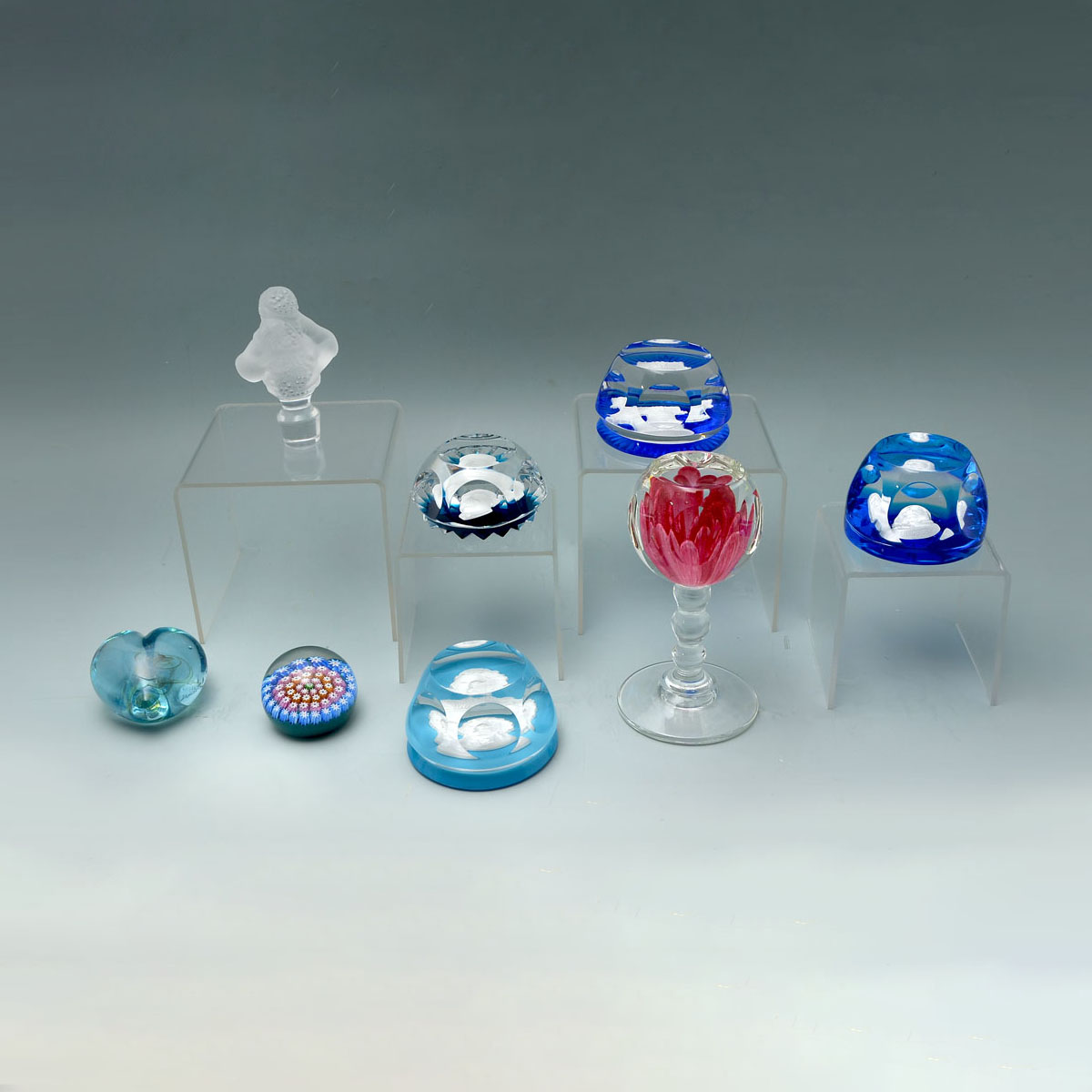 8 PIECE COLLECTION OF CRYSTAL & ART GLASS PAPERWEIGHTS: Comprising; 4 Baccarat crystal cameo sulfide paperweights (Charles Lindbergh, Thomas Payne, Woodrow Wilson, & Liberty Bell), 1 footed Baccarat flower paperweight, 1 heart shaped Gilbert & Johnson paperweight, 1 Millefiori Perthshire paperweight, and 1 Lalique crystal stopper of 2 nude women clinging to grapes. Largest piece Approx. 5.25'' h x 2.75'' w.