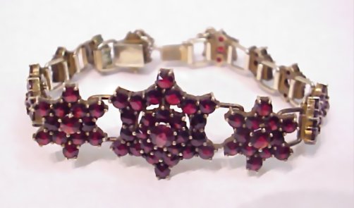 VINTAGE GARNET BRACELET: Graduated floral motif links formed of many small round cut garnets, set in sterling, pressure clasp, broken safety chain, 6''l.