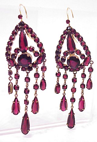VICTORIAN GARNET DANGLE EARRINGS: Many pear and round cut garnets to open work bodies and graduated dangles, new 14k yellow gold hoops for non-allergic wear, approx. 2''l. overall.