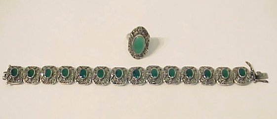 CHRYSOPRASE AND MARCASITE STERLING ENSEMBLE: To include, a multi link bracelet and matching ring, filigree and tiered mounts of sterling with oval chrysoprase surrounded by marcasite accents. Bracelet 7'' with double safety clasp, ring size 5.