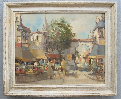 ROMIER, P., (European, 20th C): Parisian market scene, O/C, 16'' x 20'', signed lower right, encased in original frame. Condition - Needs cleaning, but good overall package.