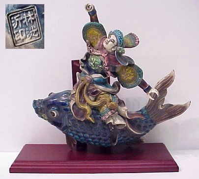 CHINESE POLYCHROME FIGURE OF A MAN RIDING A FISH: Man dressed in an elaborate costume, he probably had a lance at one time. Impressed makers mark. Mounted on a wooden stand, designed to hang on a wall. 12''h, 13''l.