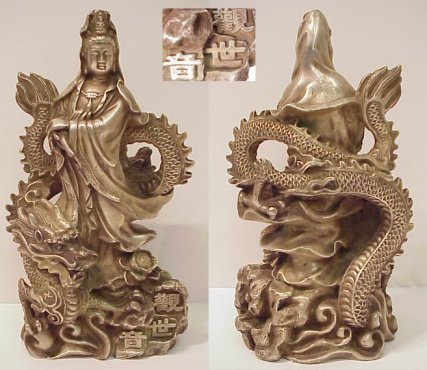 QUAN YEN WITH A DRAGON: Lovely sculpture of Quan Yen standing with a full bodied dragon slinking up her back, silver?, approx. 10''h. Great detail and presentation, Chinese characters to front of base. True age unknown.
