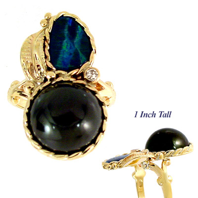 TAHITIAN PEARL & BOULDER OPAL RING: This custom created ring features a 12mm Tahitian pearl set next to a boulder opal doublet and accented by a white diamond. Retail Value $1857.00