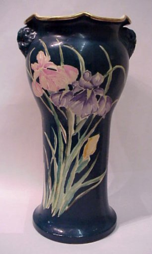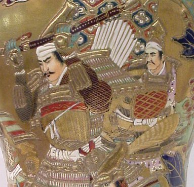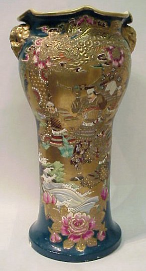 JAPANESE SATSUMA EARTHENWARE FLOOR VASE / UMBRELLA STAND: Teal ground with heavy gold and polychrome decoration of intricate Samurai scene. Please note chip to base.