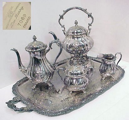 INTERNATIONAL ''DU BARRY'' TEA SERVICE ON TRAY: Fine chased silverplated tea service to include water pot on stand, 14''; teapot, 10''; creamer, 4 3/4''; covered sugar, 6''h.; and handled tray, 27''l including handles. No monograms, no dents.