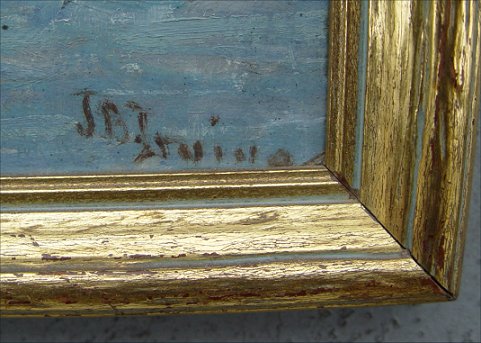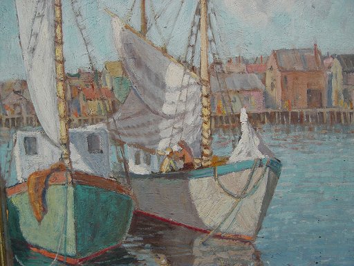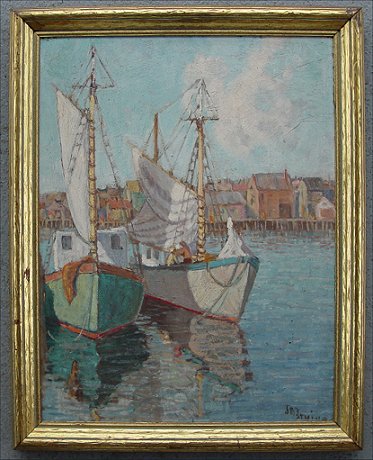 IRVING, Jeannette Bowman, (American, 20th C): ''Gloucester Harbor'', O/pressed board, 18'' x 14'', signed lower right, label affixed verso, encased in a period gilded molding with minor wear.