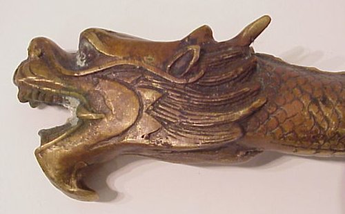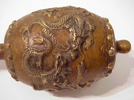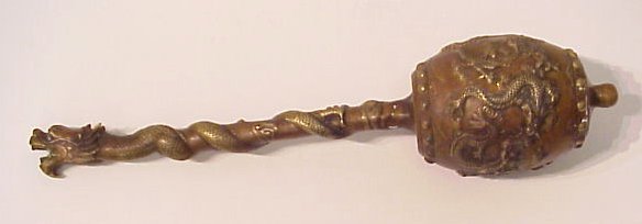 BRONZE CEREMONIAL DRAGON CLUB: Decorated with dancing dragons around the drum shaped body edged in rings of faux rivets, full bodied dragon around handle, approx. 19''l. True age unknown.