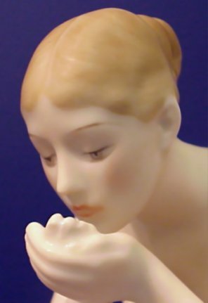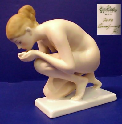 ROSENTHAL PORCELAIN NUDE DRINKING: #752/1-16. Kneeling figure of w woman drinking in her cupped hands. Designed by Ernest Wenck. 6''h, 4 3/4''l.