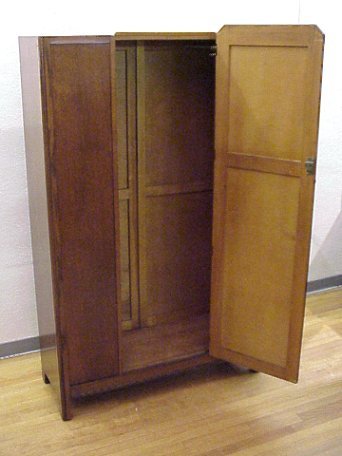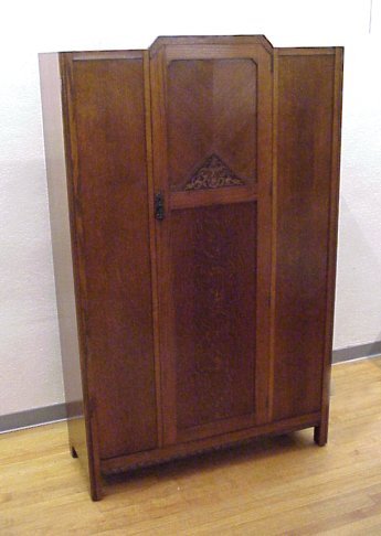 ENGLISH TIGER OAK ARMOIRE: Single door wardrobe with geometric carving to the door. Interior has rods for hanging clothes. Key locking. 74''h, x 45''w. x 17''.