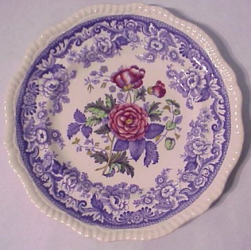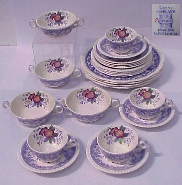 COPELAND SPODE ''MAYFLOWER'' CHINA: Service for 4 to include 4 dinner plates, 10 1/2'' dia., 4 salad plates, 7 3/4'' dia. 4 handled soup bowls with underplates, (repair to one handle), 4 cups and saucers. Old English lavender transfer and floral design.