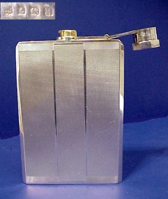 ENGLISH STERLING FLASK: Textured pattern on a flask with a twist secure hinged cap. 5''h. x 3 1/2'' excluding cap.