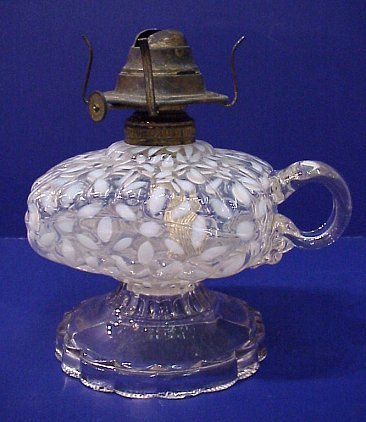 SNOWFLAKE WHITE OPALESCENT FINGER OIL LAMP: One of the earlier pedestal base finger lamps. Approx. 5''h. excluding the chimney.