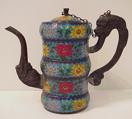 ADORABLE CLOISONNE TEAPOT: Turquoise blue lobed body decorated with red, blue and yellow flowers, mythical beast for handle and spot, cloisonne lid secured with a chain, approx. 6 1/4''h. True age unknown.