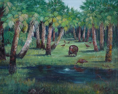 KOSTER, Peter, (American, 20th C): Florida Landscape with turkey, O/C, 22'' x 28'', signed lower right, circa 1940. Condition - Puncture/indentation in upper right corner.