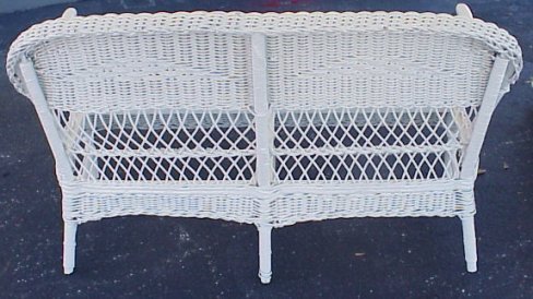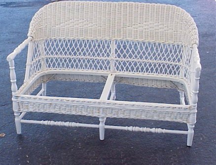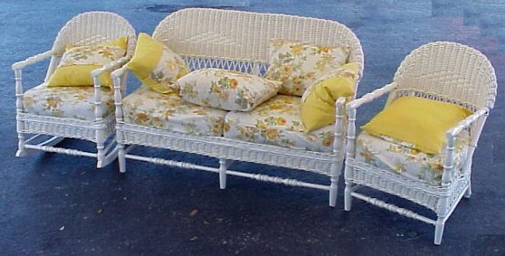 3 PIECE ART DECO WICKER SET: Sofa, 51''l, rocking chair and arm chair. Fresh white painted finish, spring cushions.