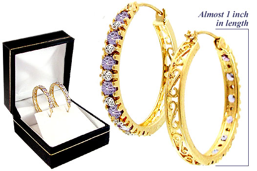 TANZANITE & DIAMOND HOOP EARRINGS: These elegant and attractive earrings each feature round shaped gorgeous bright and sparkly Tanzanite gemstones, 1.25cttw, along with white diamonds and all set in 14K gold. Retail Value $499.00