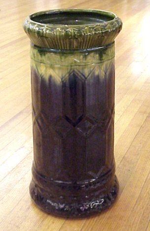 MAJOLICA GLAZED POTTERY UMBRELLA STAND: Attrib. to McCoy. Rich jewel tone cobalt and green glaze. 22''h. 10'' dia. No identifying marks. Old darkened chip on rim.