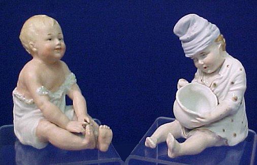 HEUBACH PIANO BABY: Lifelike little figure with the Heubach sun mark and Made in Germany red stamp. Sold with another German bisque piano baby with a pot in his hands. Each approx. 3 1/2''h. No chips or cracks.