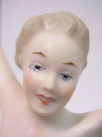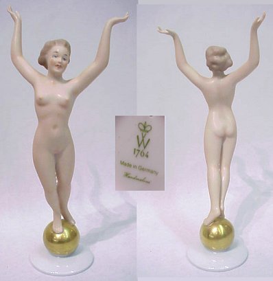 WALLENDORF FIGURE OF NUDE: Embracing the world standing on a gold ball, 11 1/2''h. Green crown over W 1764 mark. Impressed number 1528.