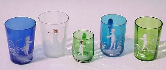 FIVE MARY GREGORY GLASS TUMBLERS: Group of multi-colored glass featuring a blue mug dated World's Fair 1893, a 2 3/4'' green mug, and cobalt, clear and green tumblers. Approx. 4''h. Each painted with a different image of a child.