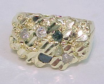 MEN'S GOLD NUGGET & DIAMOND RING: A ring featuring many shades of diamonds including blue, teal, canary, cognac & white. All set in the 10k yellow gold nugget band. Retail Value $875.00