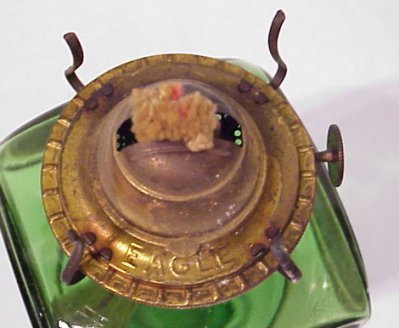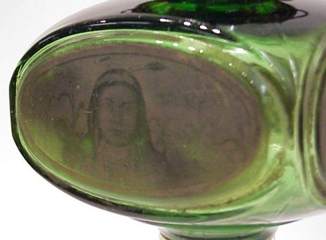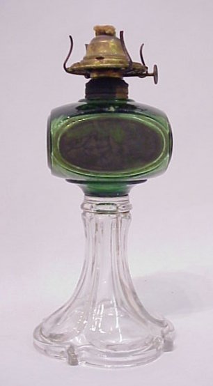 EARLY GREEN GLASS OIL LAMP WITH PORTRAIT PANELS: Green glass on a clear stem. Each of the four sides has a portrait of a historically significant woman. 16 1/2''h. including chimney.