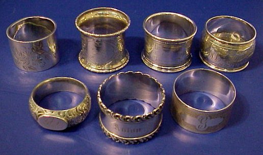 GROUP OF 7 STERLING AND PLATED NAPKIN RINGS: The first three are sterling and feature Tiffany & Co monogrammed for Anton, a Victorian bright cut Gorham, and one that bears English hallmarks. The remaining four have no identifying marks for maker or silver content.