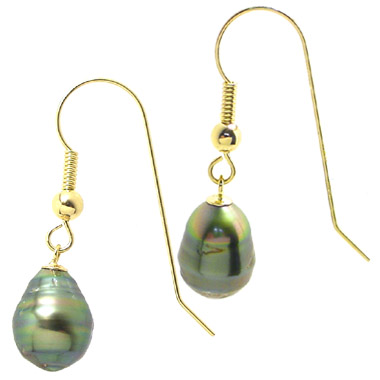 TAHITIAN PEARL EARRINGS: Beautiful drop shaped Tahitian pearls, 9.5/10mm, that hang from 14k yellow gold shepherd hook earrings. Retail Value $899.00
