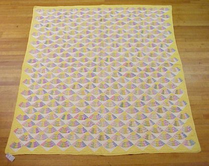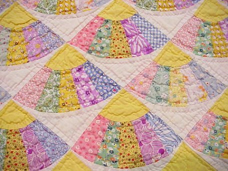 FAN QUILT: Hand quilted, brightly colored older quilt. Approx. 7'1'' x 6'3''.
