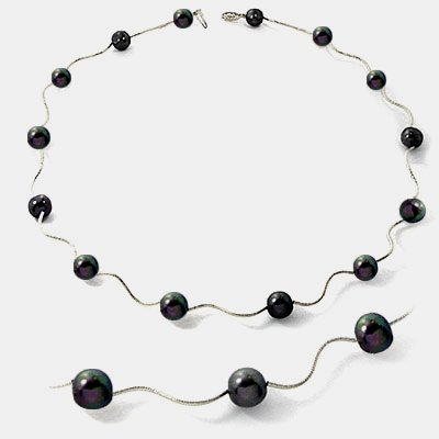 BLACK PEARL WAVE NECKLACE: This unique 16'' necklace features 14 black pearls, 9mm, strung with diamond cut 14kt white gold waving S bar links that measure about 1'' each. These large pearls are semi round in shape, nice in lustre and the color is a gorgeous peacock black with overtones of green and purple. This necklace is finished with a 14kt fish hook clasp. Retail Value $432.88