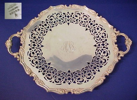 GORHAM RETICULATED TRAY, CA. 1908: Handle plate, 6036A, 15 1/2'' dia. to handle ends. Monogrammed. Approx. 24.3 oz.