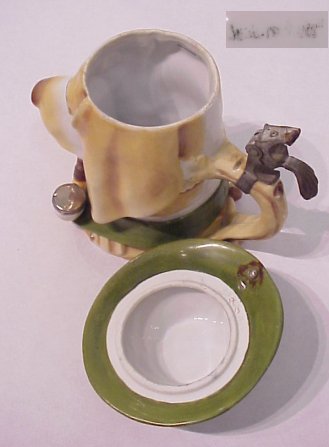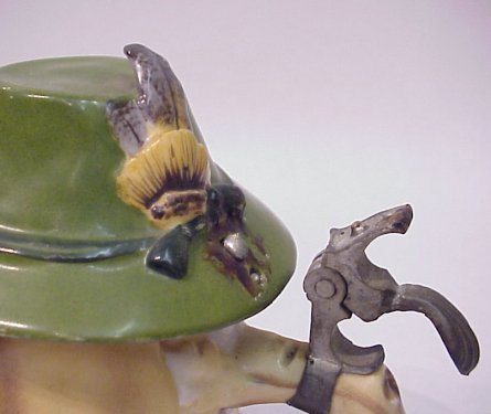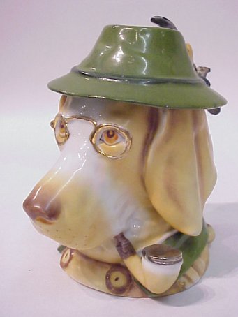 FIGURAL DOG STEIN: Porcelain dog character with pipe and eye glasses. Blurred makers mark on the underside. Lid in the form of a hat, separated from hinge. Approx. 7''h.