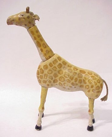 SCHOENHUT JOINTED WOODEN GIRAFFE: Leather ears, cord tail, played with condition. 10 1/2''h.