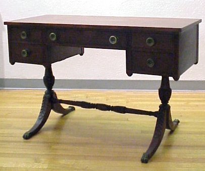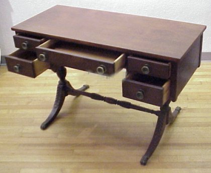 SHERATON STYLE MAHOGANY DESK: 5 drawer writing table, twist carved stretcher between carved splayed legs. Nice substantial round brass pulls. Approx. 28 1/2''h, 44''w, and 19'' deep.