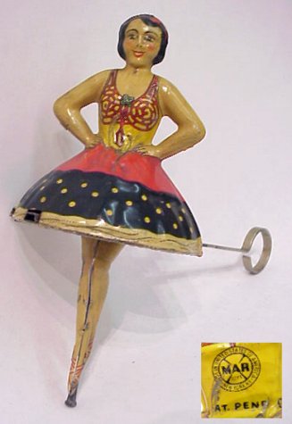MARX TIN WIND UP TOY SPINNING BALLERINA: Pull the long serrated key and watch her spin. Approx. 5 1/2''h. Good working order.