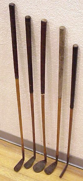 5 THOM STUART HICKORY SHAFT GOLF CLUBS