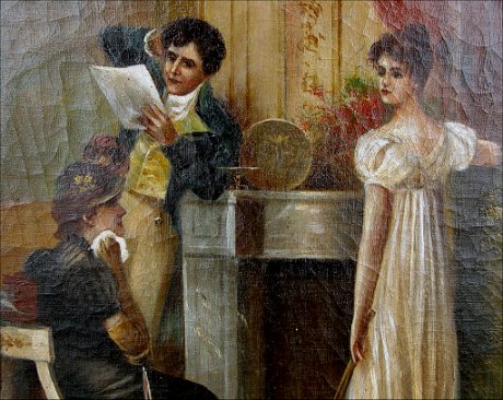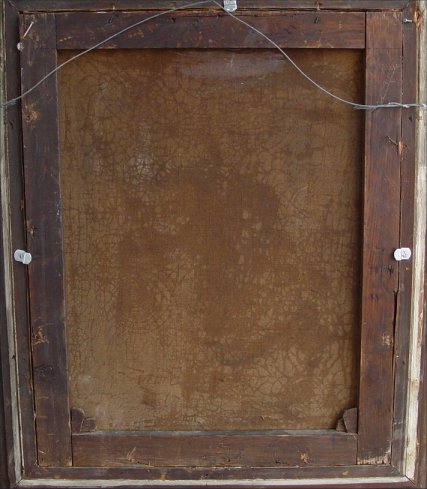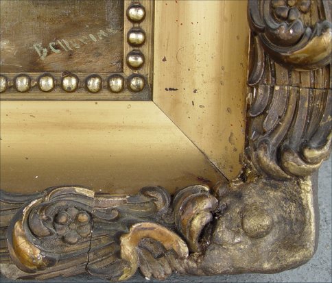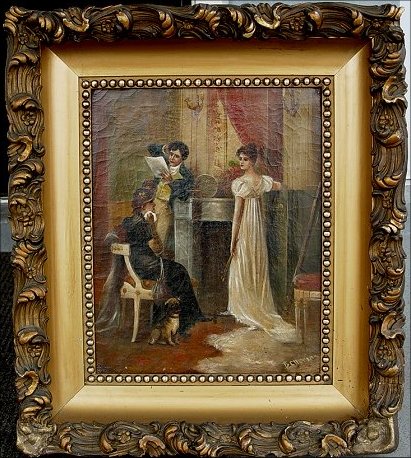19TH C O/C GENRE INTERIOR SCENE: Depicts 3 figures in an interior, 20'' x 16'', signed lower right B Cherina?, encased in elaborate period heavy gesso gilded frame with restoration to lower corners. Condition - Craquelier throughout, visible in paint, possibly added signature.