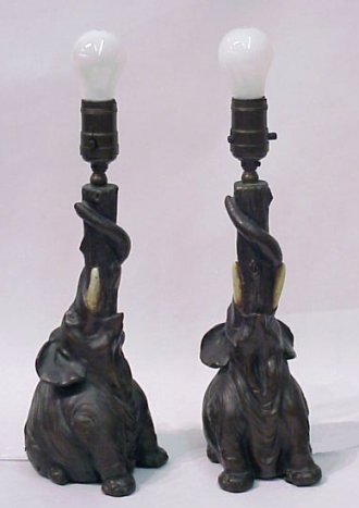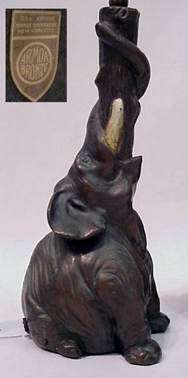 PAIR OF ARMOR BRONZE ELEPHANT LAMPS: Bronze clad elephant with trunk wrapped around tree, cold painted tusks. Paper label on one of the lamps. Figural part of lamp is 11''h.
