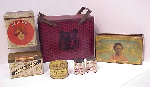 COLLECTION OF 7 TOBACCO TINS: Featuring a Tiger bright sweet chewing tobacco basket type tin with handles, 7 1/2''h. Red Dot display tin 5 1/2''h. Also in this lot is a Hillen's Red Anchor, Havana Ribbon, and Balkan Sobranie tin, and a pair of unopened Garrett & Sons snuff samples.
