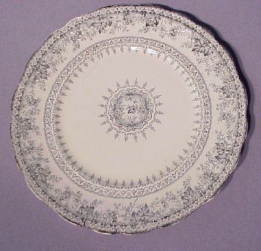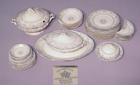 BURSLEM STAFFORDSHIRE SEMI-PORCELAIN TRANSFERWARE CHINA SERVICE, CA. 1889-1939: ''The Devonshire'' in blue. 42 piece set to include 6 DINNER plates, 10'' dia.; 6 LUNCHEON plates, 9'' dia.; 6 BREAD plates, 6 7/8'' dia.; 6 low BOWLS, 7 1/4'' dia.; 6 saucers; large 16'' PLATTER; round covered TUREEN, 9'' dia.; oval covered VEGETABLE, 12''l.; 2 dessert bowls, and a covered butter (repair). Age discoloration throughout.