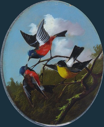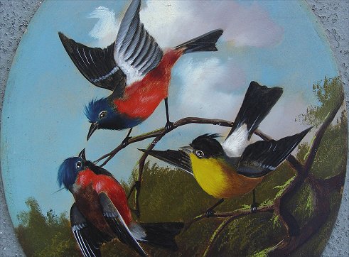 19TH C OVAL O/B OF BIRDS IN A LANDSCAPE: 11 1/2'' x 9 1/4'', marked verso ''Mrs. ?Northrup'', encased in period gilded ogee frame with some wear and dent. Condition - Some damage to board in margin of upper right corner, some minor paint loss to center.