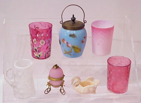 SWEET COLLECTION OF ART AND COLLECTIBLE GLASS: To include a Cambridge Crown Tuscan swan salt, cranberry enameled and lacy opalescent tumblers, mother of pearl pink opalescent tumbler, pink satin glass egg, miniature oil lamp, coin spot opalescent pitcher, and a blue opaque jam jar.