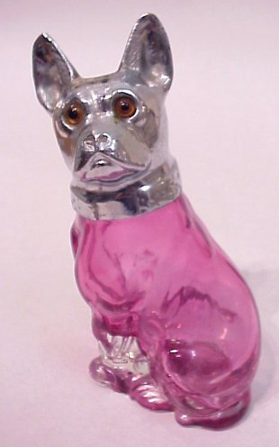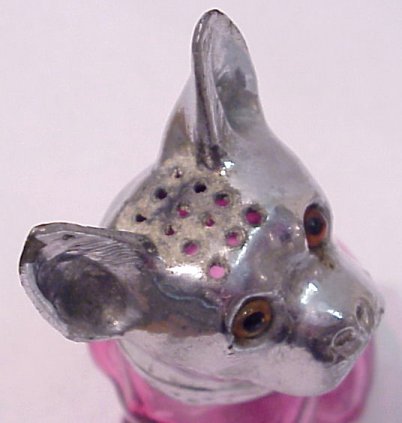 CRANBERRY GLASS DOG FIGURAL MUFFINEER: Cranberry glass body, silver tone metal head with glass eyes. Approx. 6''h.