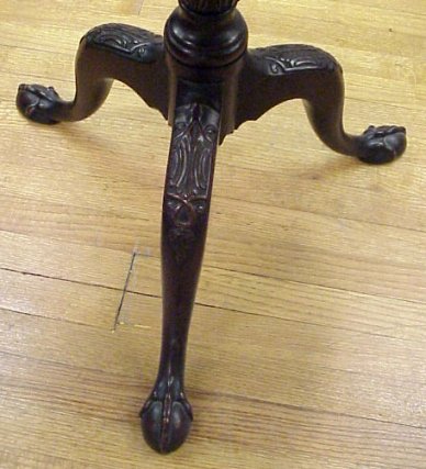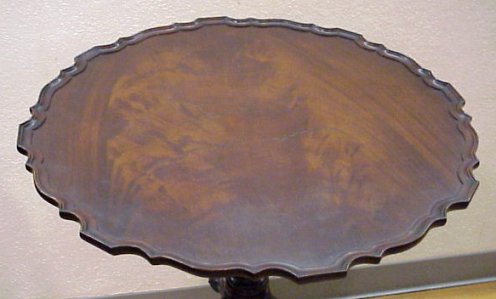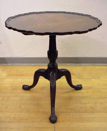 CARVED MAHOGANY TILT TOP TABLE: Crotch grain mahogany top, pie crust edge. Ball and claw feet. 28'' dia. 27 1/2''h.